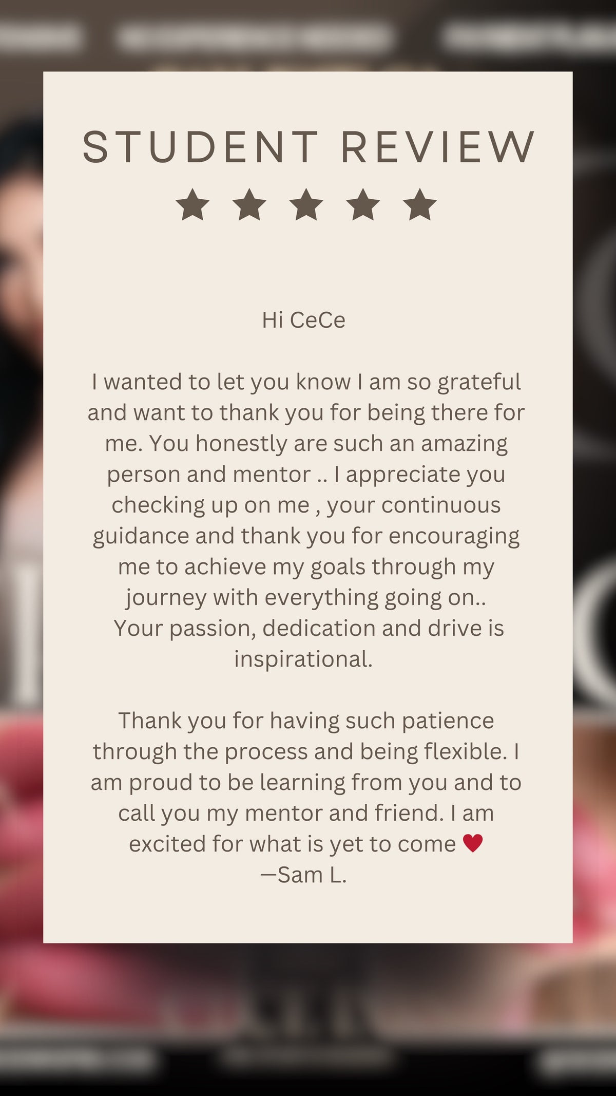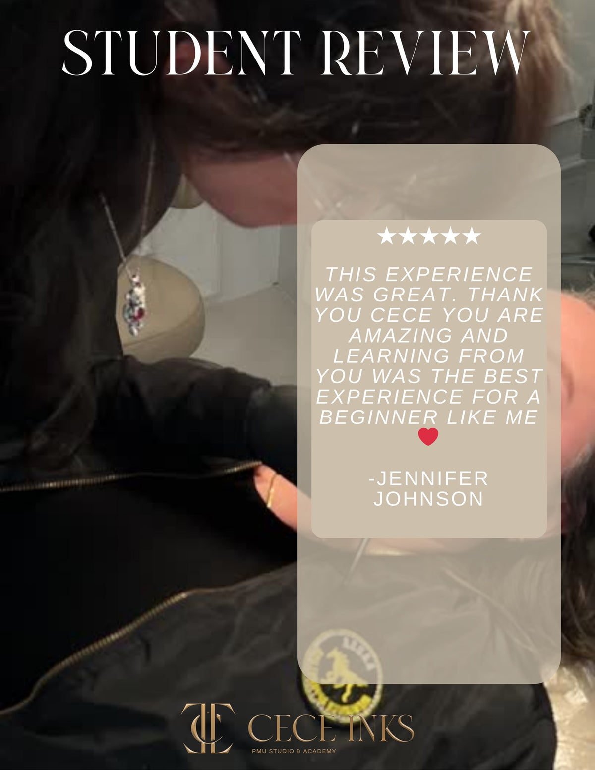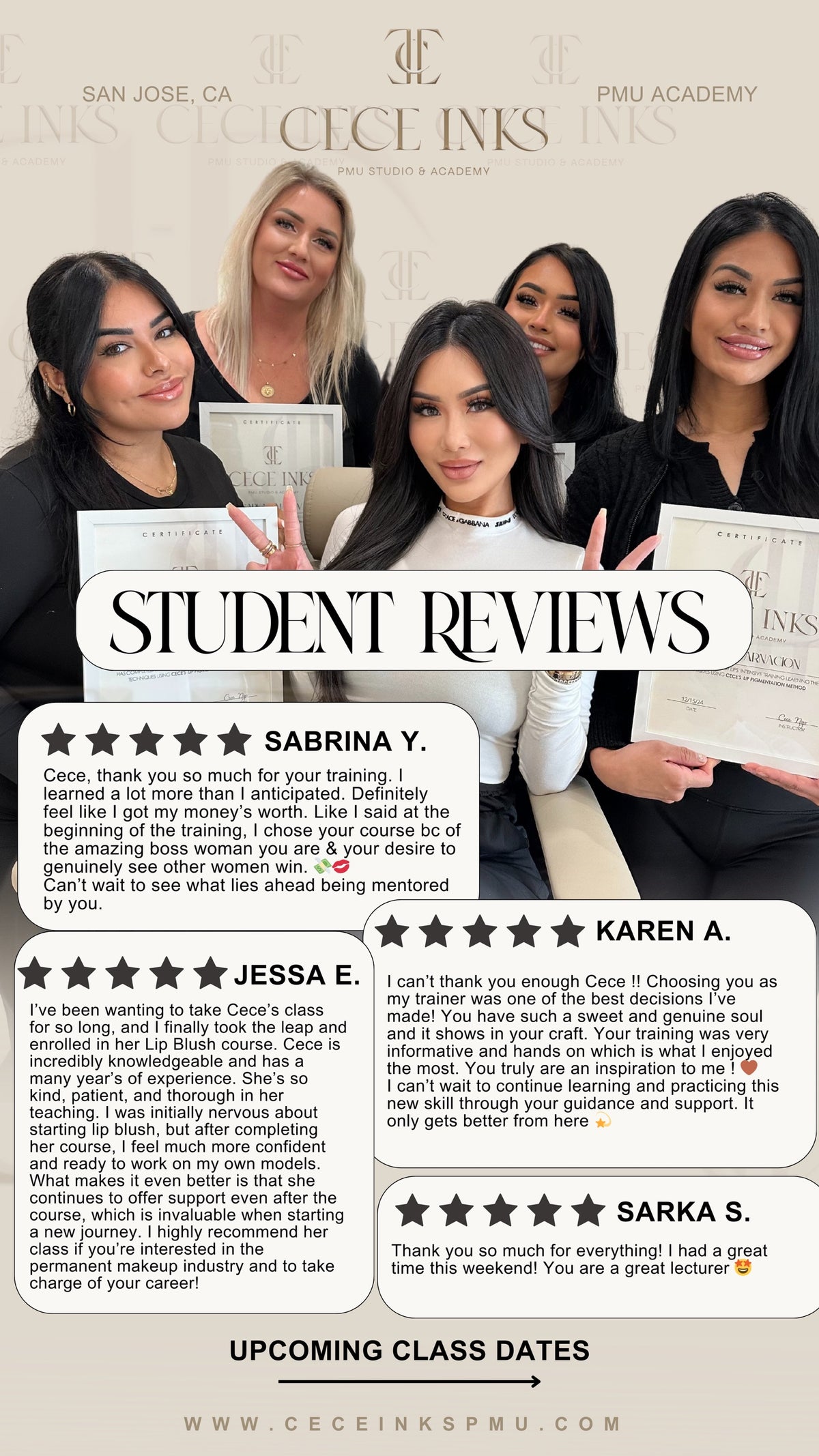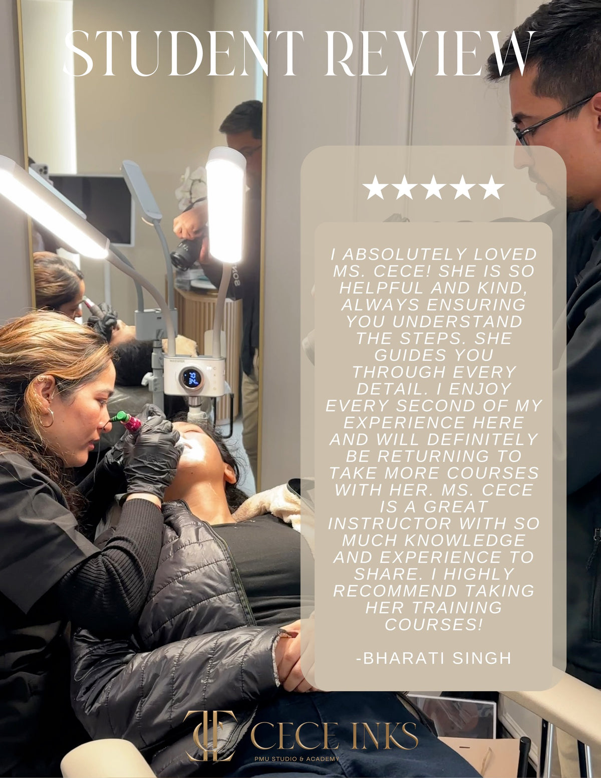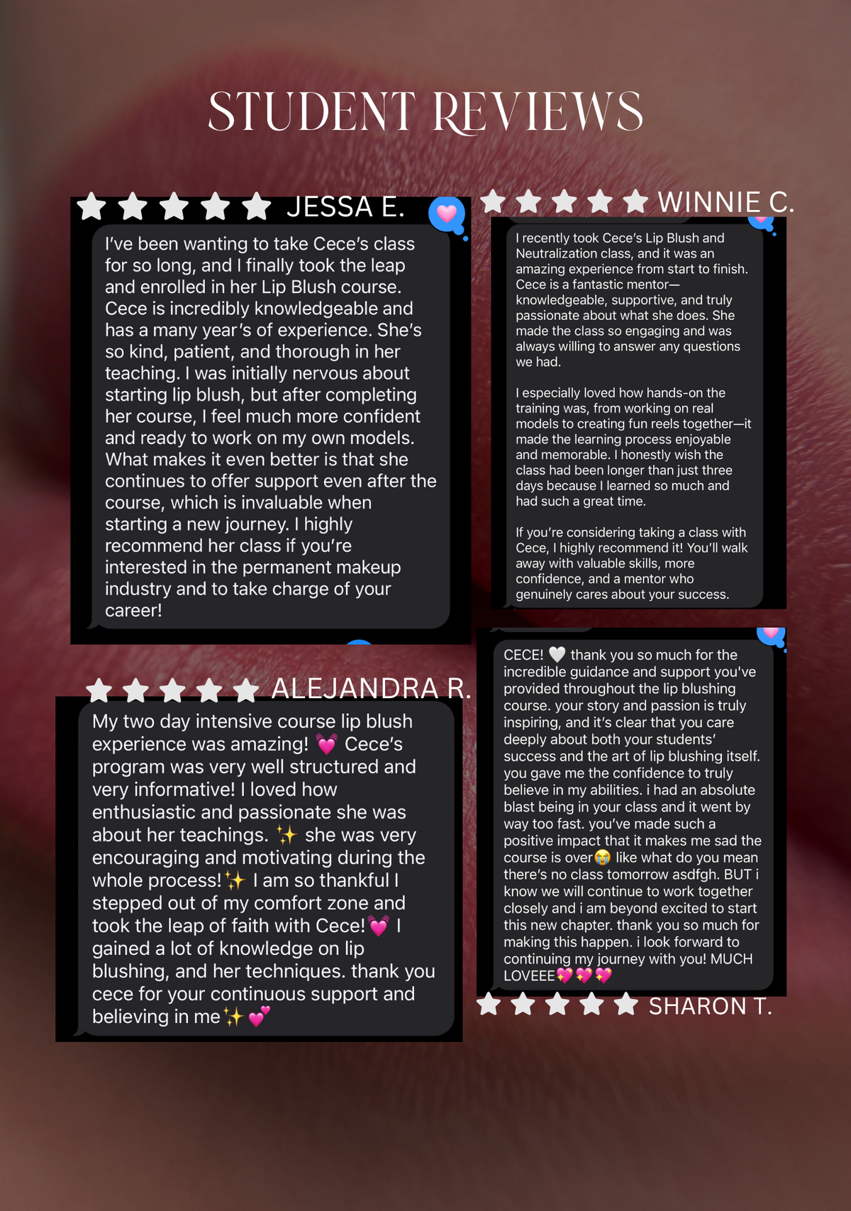 I recently took Cece’s Lip Blush and Neutralization class, and it was an amazing experience from start to finish. Cece is a fantastic mentor—knowledgeable, supportive, and truly passionate about what she does. She made the class so engaging and was always willing to answer any questions we had. I especially loved how hands-on the training was, from working on real models to creating fun reels together—it made the learning process enjoyable and memorable. I honestly wish the class had been longer than just three days because I learned so much and had such a great time. If you’re considering taking a class with Cece, I highly recommend it! You’ll walk away with valuable skills, more confidence, and a mentor who genuinely cares about your success.